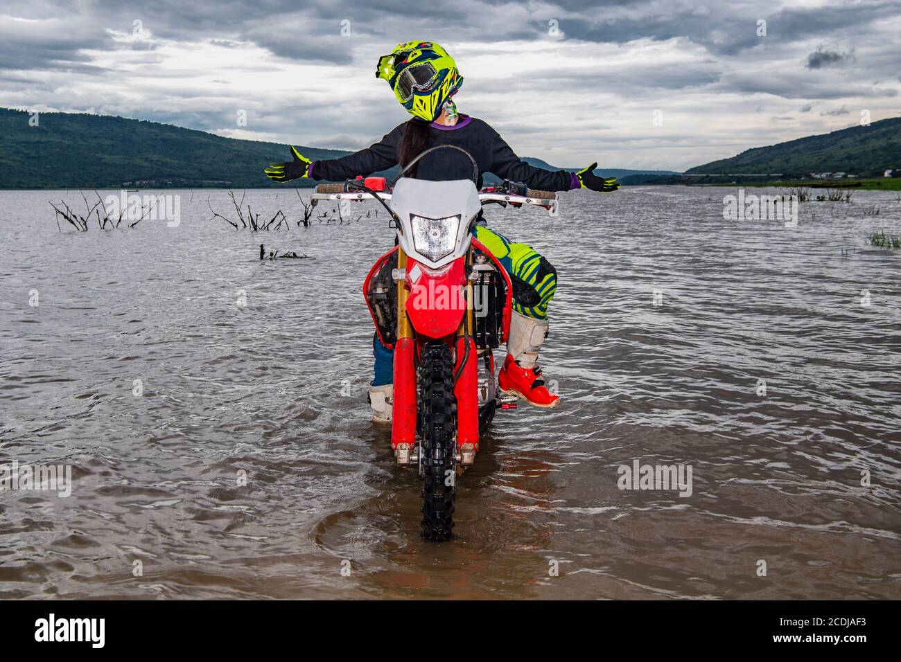 Woman Posing On Her Dirt Bike In A Lake Near Pak Chong Thailand Stock Photo Alamy